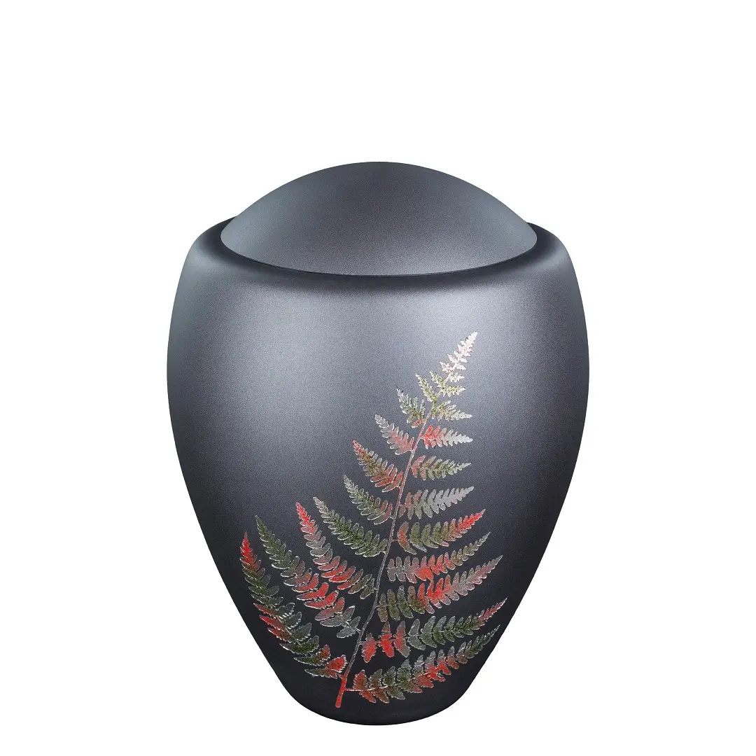 The detailed fern motif adds a touch of natural grace and timeless beauty. The urn is completed with a matching glass lid, seamlessly fitting to ensure a secure and dignified resting place. The classic, rounded silhouette of the urn provides a timeless and graceful memorial.